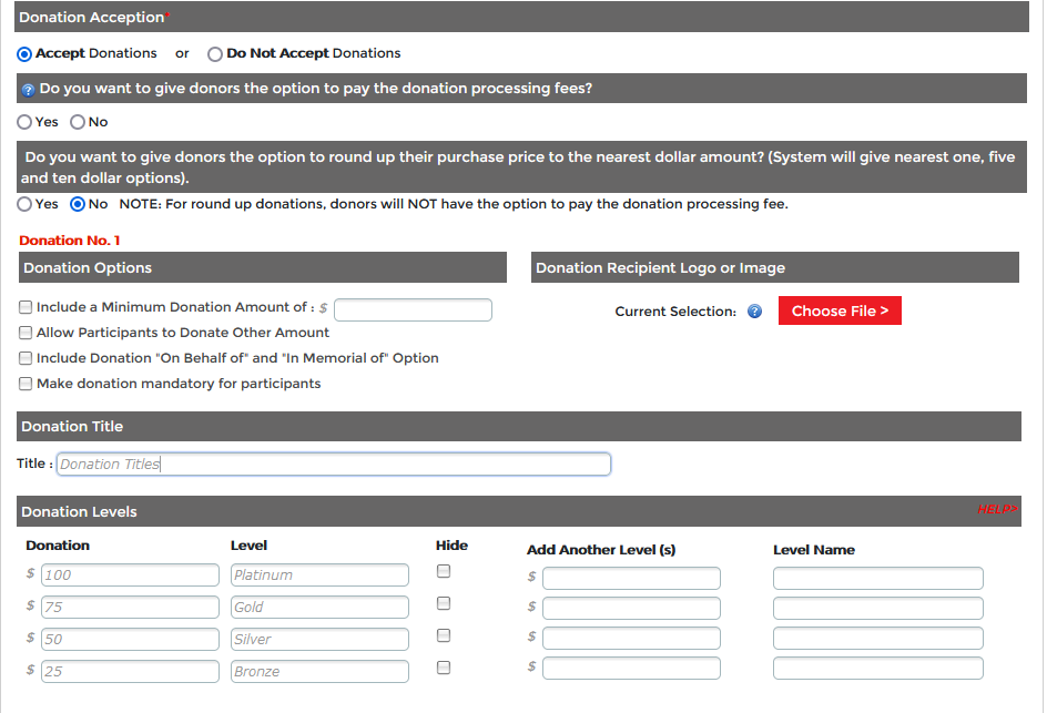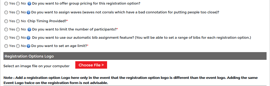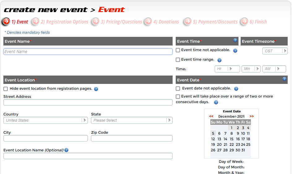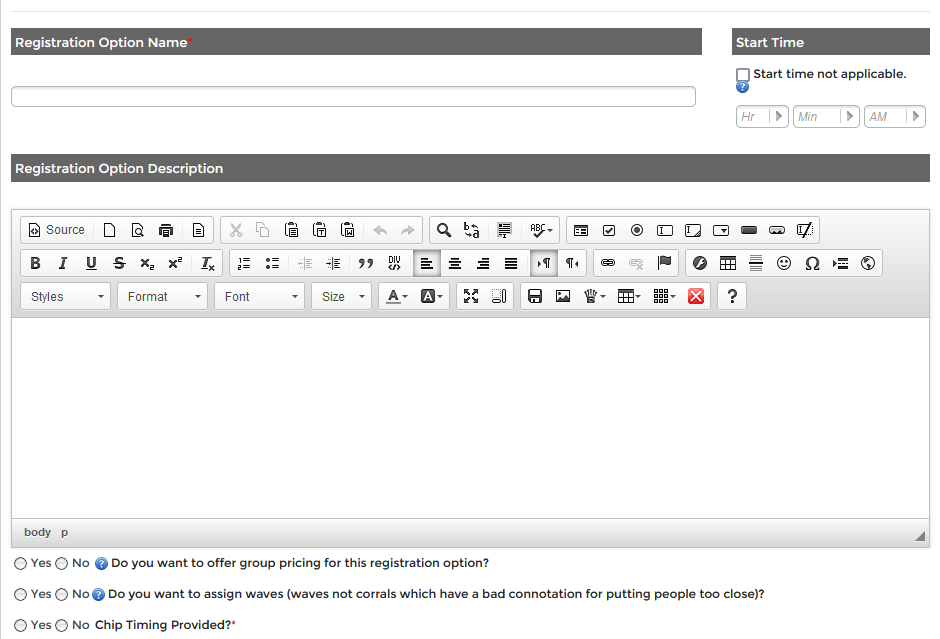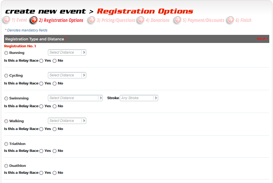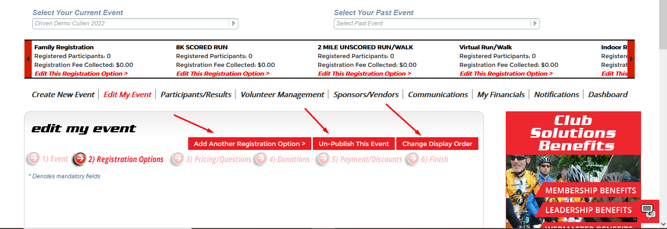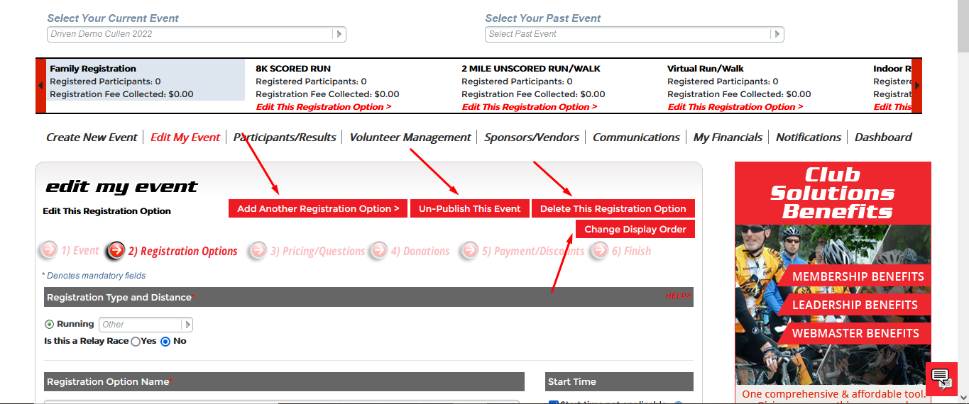 Step 3 - Registration options. Here you will create an event entry choice, and type of event being organized. A registration option will need to be created for each entry choice. For example, adult entry, youth entry, etc.