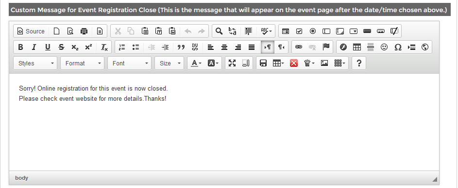 You can setup a custom message for event registration close (This is the message that will appear on the event page after the date/time chosen above).