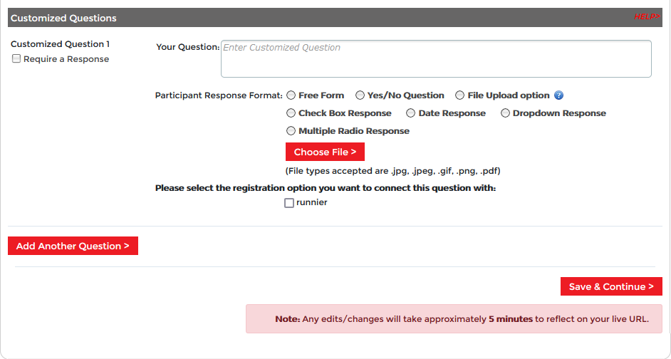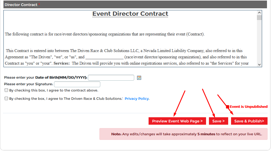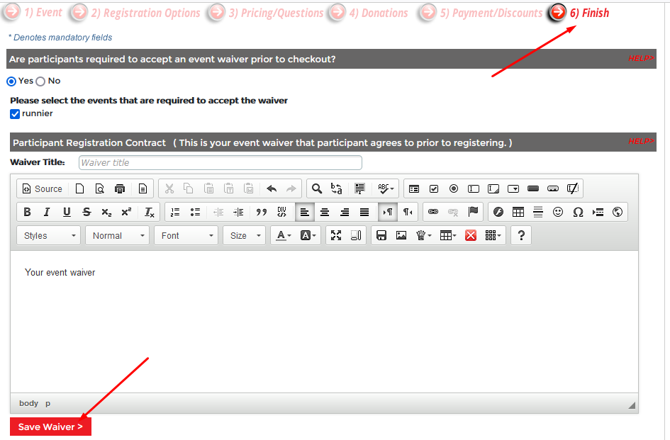 Step 7 - Finish. This is the last step to having your event ready to accept signups. This final step is where you can upload event waivers, contact information, access your unique registration Link (URL), and publish event to live.