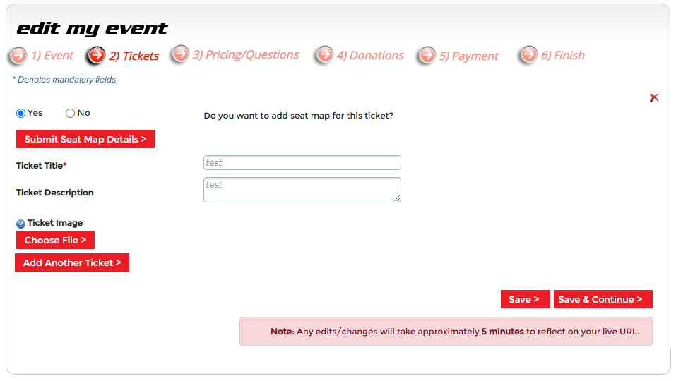 Step 3 - Tickets. Here you will create an event entry choice, and tickets you want to sell. A ticket will need to be created for each entry choice. For example, gala music, dinner, etc.