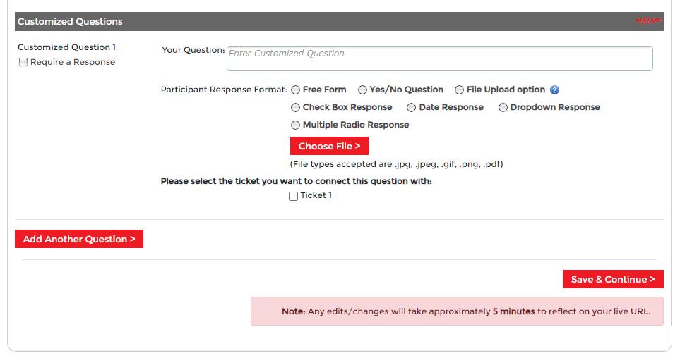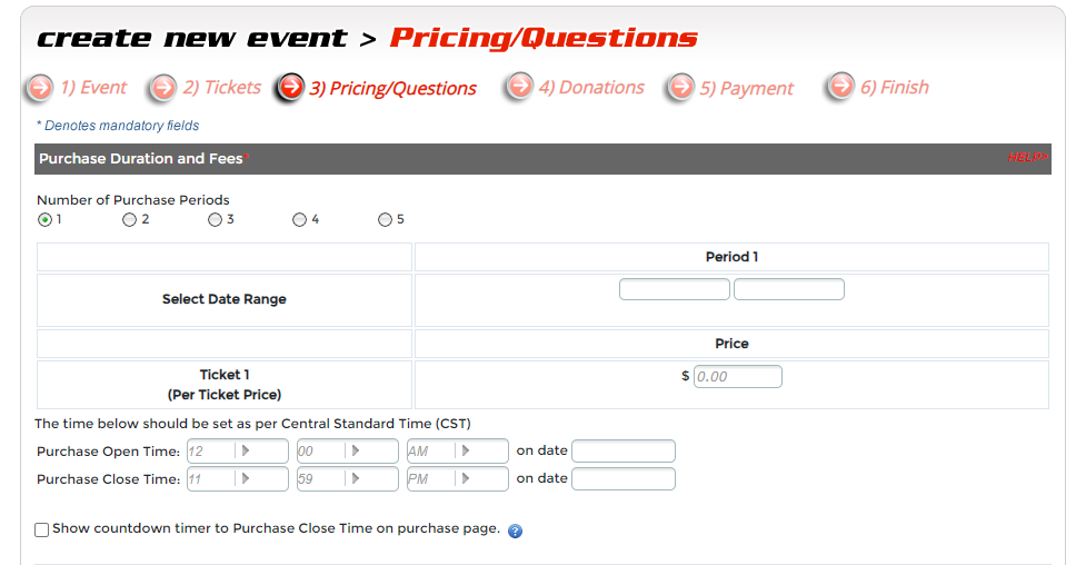 Step 4 - Pricing and Questions. Here you will setup the ticket purchase calendar to turn on and turn off ticket purchase, assign purchase fees to your Ticket(s), and price increases. This step also allows you to create unique questions for your event that you want an attendee to answer when they are signing up.