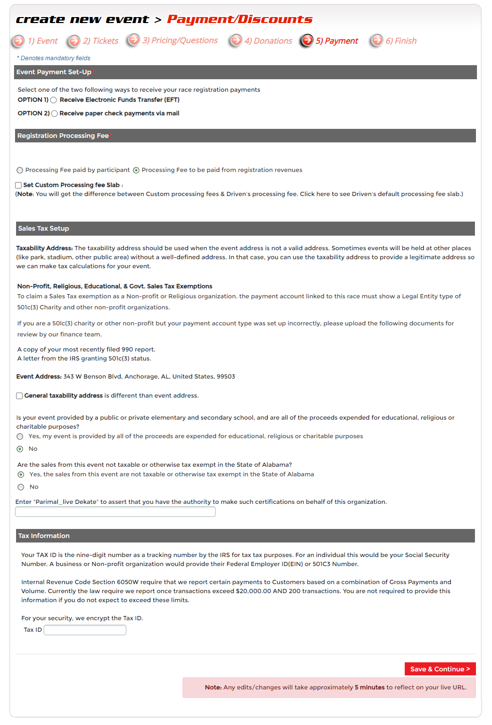 Step 6 - Finish. This is the last step to having your event ready to accept signups. This final step is where you can upload event waivers, contact information, access your unique registration Link (URL), and publish event to live.