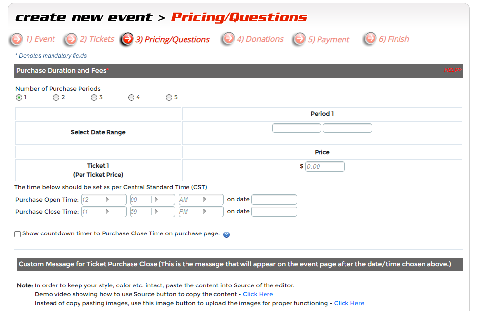 The Driven's pricing and attendees questions feature gives you a great deal of flexibility to customize your event even further. Here, you can select up to five purchase durations in full graphical calendar format as well as set specific fees for each period, all while having the ability to charge different fees for each ticket. For example, you might set a lower fee for early registration and a higher fee for late registration. In this step, you also have the capability to ask a variety of questions to your attendees such as birth date, as well as custom questions you create. The customization continues as you decide whether a response is required and you can differentiate your questions for multiple tickets within your event. This feature is critical when specific attendee information is needed.