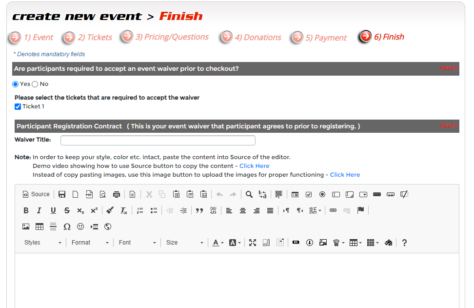 Now that you have customized all facets of your ticketing and payment processes, you are ready to close the deal. On the finish page, you can upload/ include your attendees waiver and format a customizable ticket purchase confirmation email, and even decide whether you/your event sub-administrators will receive an email notification when someone purchase ticket for your event. You will also be prompted to select theme colors and whether you want to have a QR code generated for your ticketing page. Before going "live", you can preview your ticketing page. Remember that we provide complete Event Solutions. When you are ready to open your event page to go live, simply click "Save and Publish". Doing so will also feature your event on The Driven's searchable Event List. Your event will be assigned a unique URL which can be integrated into your HTML page. If you encounter a problem or have questions, simply Contact Us for prompt, personalized service.