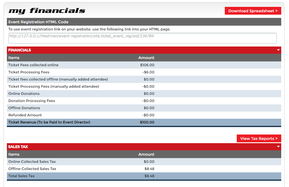 With the My Financials feature, The Driven gives you 24/7 access to your event's financial reports. You can view your reports for your entire event or by particular ticket. Your financial statement will show you total event fees and donations collected. You'll also see a history of your event payouts with your selected pay option. Your financial report can be downloaded to an easy-to-read spreadsheet, enabling you to easily share with your event committee as needed.
