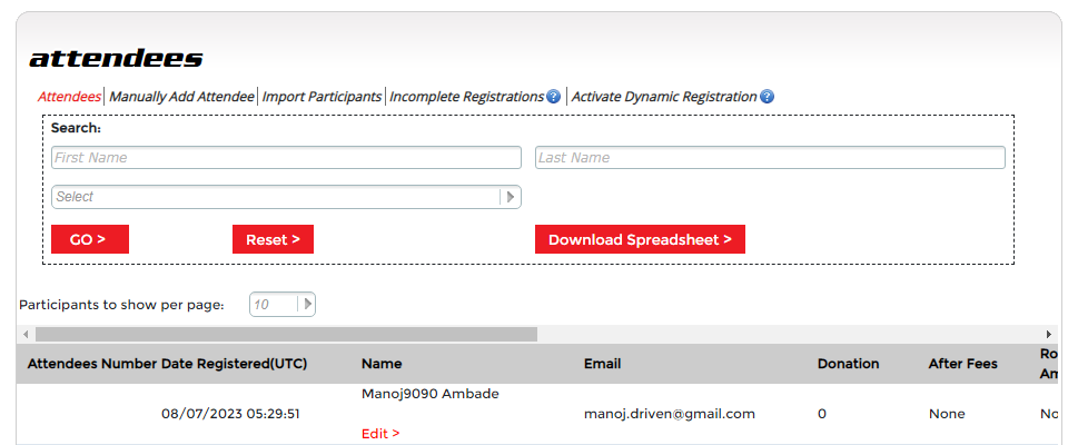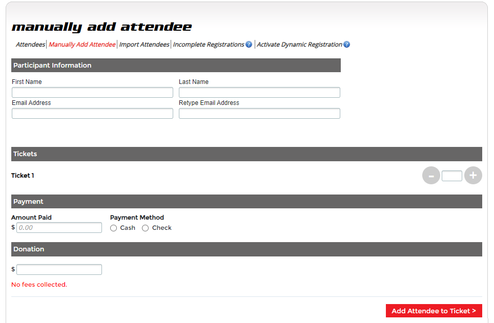 Adding attendees manually is easy with The Driven. Simply click on the Manually Add Attendees tab and enter in the attendee's information and then complete the process by clicking the "Add Attendee to Ticket" at the bottom right. Manually added attendees will automatically and immediately appear in your attendees summary reports, as will day-of-event attendees, using our Dynamic Registration feature featured on the next page.
